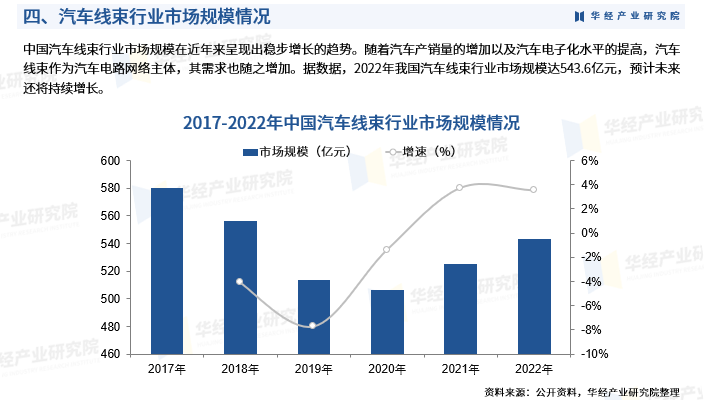 中國汽車線束行業(yè)市場規(guī)模在近年來呈現(xiàn)出穩(wěn)步增長的趨勢。隨著汽車產銷量的增加以及汽車電子化水平的提高,汽車線束作為汽車電路網絡主體,其需求也隨之增加。據(jù)數(shù)據(jù),2022年我國汽車線束行業(yè)市場規(guī)模達543.6億元,預計未來還將持續(xù)增長。