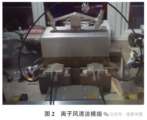 FAKRA自動化生產(chǎn)線在完成翻網(wǎng)和芯線剝皮之后,必須設(shè)置一個離子風(fēng)清潔模組,如圖2所示。通常采用線纜上部吹風(fēng),下部吸風(fēng),將附著在線纜頭部的屏蔽斷絲、游離金屬異物,利用離子風(fēng)清潔干凈。必要時,在穿外導(dǎo)體前再增加一個離子風(fēng)清潔模組,確保插入外導(dǎo)體的中心針是清潔、無異物附著的,如圖2所示。
