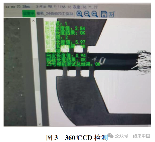 行業(yè)內(nèi)通常采用弱電檢測內(nèi)絕緣處、芯線和屏蔽絲有無通路,這種接觸式檢測有可能改變芯線的狀態(tài)。另一種是采用360℃CD 檢測屏蔽絲飛絲。通過旋轉(zhuǎn)鏡頭拍照,對半成品內(nèi)絕緣、芯線區(qū)域設(shè)定敏感區(qū),要求敏感區(qū)內(nèi)無異物,這種無接觸的檢測可以作為優(yōu)選,如圖3所示。