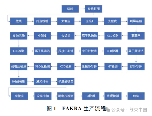 FAKRA線束自動化生產(chǎn)線通常有兩種: 第一種是包含全自動切線、打圈、捆扎,自動化設(shè)備抓取導(dǎo)線、剝外膠皮、壓接、穿外導(dǎo)體、穿塑殼、成品線束導(dǎo)通及收線,這種自動化方案是全自動的FAKRA產(chǎn)線方案;第二種是人機結(jié)合的生產(chǎn)線方案,該方案將全自動切線打圈捆扎機同自動化生產(chǎn)線主機分離,后段采用人工穿塑殼,自動化生產(chǎn)線只做中間的剝皮、壓接中心針、穿外導(dǎo)體、耐壓檢測等中間工序,半成品線束下線后,人工穿塑殼、耐壓檢測、SI檢測、外觀檢測、包裝。FAKRA生產(chǎn)流程如圖1所示。