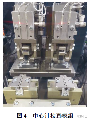 中心針校直模組設(shè)計方案,由于中心針端子在壓接后,要從鉗口中脫模,某種特殊條件下,中心針的脫模過程會導(dǎo)致中心針端子和線纜發(fā)生不同程度的彎曲。為保證中心針端子順利插入外導(dǎo)體組件,在中心針穿(壓接) 外導(dǎo)體模組之前一定要設(shè)計一個中心針校直模組,如圖4所示,確保中心針穿外導(dǎo)體的時候端子平直,提高插入合格率。該模組采用軟塑膠材質(zhì)的平面對端子施壓3~5N, 當(dāng)校直不良品端子(飛絲) 時,有可能導(dǎo)致飛出的銅絲碎屑掉落在中心針校直區(qū)域,碎屑有可能會被下一個合格的中心針給吸附粘走,導(dǎo)致產(chǎn)品的短路。因此,要在中心針校直模組上增加一個吹氣裝置,當(dāng)中心針端子每校直一對后,端子離開校直模組后的空閑節(jié)拍時間內(nèi),對中心針端子校直區(qū)域吹氣清潔,防止掉落在校直后的合格端子上吸附(沾上) 金屬異物。
