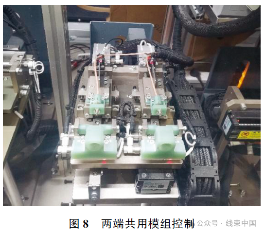 導(dǎo)通耐壓檢測模組的防錯設(shè)計,對于雙端生產(chǎn)模式的自動化FAKRA生產(chǎn)線,左右兩端的耐壓檢測對接機構(gòu)應(yīng)采用由兩個伺服電機單獨控制伸縮距離。當(dāng)產(chǎn)線加工兩端物料類型相同的FAKRA產(chǎn)品時,兩個模組前進(jìn)和后退的尺寸相同,當(dāng)兩端加工的物料類型不相同時,由于外導(dǎo)體的長度和中心針端點位置不同,耐壓檢測模組的測試接頭尺寸、位置也不一樣,需要單獨控制。這種兩端單獨控制模組的機構(gòu)復(fù)雜、設(shè)備制造成本高,但控制精度較高,如圖7所示。
