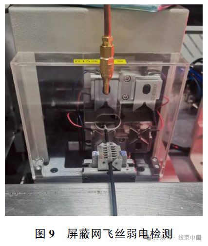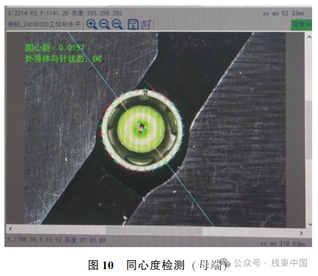 采用CCD影像檢測FAKRA同軸線纜屏蔽絲切斷,檢測有無飛絲,檢測壓接金屬箍后屏蔽絲翻網(wǎng)是否徹底,有無飛出屏蔽絲在中心針壓接區(qū)的效率和可靠性,精度遠(yuǎn)遠(yuǎn)大于傳統(tǒng)的弱電接觸式檢測,如圖9所示。
