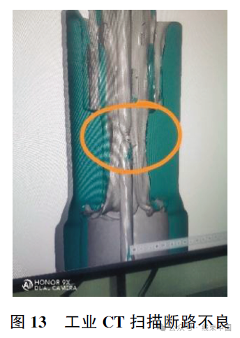 2) 工業(yè)CT檢測。由于X-RAY 的功率過小或設(shè)備性能問題,部分金屬層厚度大的FAKRA外導(dǎo)體,則無法看清內(nèi)部的不良狀況。因此,可以借助工業(yè)CT對故障線束的兩端進(jìn)行CT全尺寸掃描,利用工業(yè)CT的控制軟件對掃描的3D數(shù)據(jù)進(jìn)行切片分析,如圖13所示。