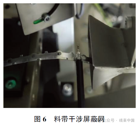 增加廢料帶隔離組件,如圖5所示,在雙端同時加工的自動化生產(chǎn)線上,通常情況下,先將左端的中心針穿外導(dǎo)體,然后壓接外導(dǎo)體,這個時候右端的中心針處于懸空狀態(tài)。當(dāng)左端壓接模組上的料帶切斷刀鈍了,無法正常切斷廢料帶,將導(dǎo)致多余的料帶向上弓起,如圖6所示,干涉線束右端的屏蔽絲,壓接設(shè)備后退時將已經(jīng)翻網(wǎng)徹底的屏蔽絲掛扯并拉到和中心針區(qū)域,當(dāng)右端穿外導(dǎo)體時,出現(xiàn)短路的不合格產(chǎn)品。因此,壓接左端外導(dǎo)體的壓接機模具的廢料帶一側(cè),必須增加一個廢料帶隔離板,將廢料帶和右端線纜完全隔離,避免產(chǎn)生嚴(yán)重的短路不合格品或有潛在質(zhì)量風(fēng)險的產(chǎn)品流出。