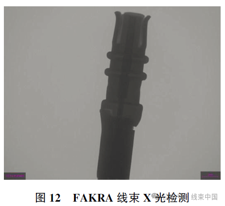1) X-RAY 無損檢測。當(dāng)FAKRA產(chǎn)品出現(xiàn)斷路或者短路的情況,可以將不良品用X-RAY 進(jìn)行照射檢查,如圖12所示。通過調(diào)整X-RAY 設(shè)備,放大或縮小局部區(qū)域,查出導(dǎo)致不良的問題點,并分析不良的故障點、不良品的類型。